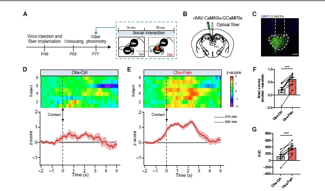 共情,即感知并分享他人感受的能力,是社会交往的基石。为了在实验室中研究这一复杂情感,团队首先建立了小鼠的“传染性疼痛”模型。当一只小鼠与它熟悉的、正经历疼痛的同伴互动后,它自身的疼痛敏感度也会显著提高,表现出“感同身受”的行为特征。然而,研究团队发现,经历过“母婴分离”应激的小鼠(即在幼年期每天与母亲长时间分离,持续一周)在成年后面对同伴的痛苦时,这种“感同身受”的反应明显减弱。这表明,早期的逆境经历特异性地损伤了其成年后的共情功能。