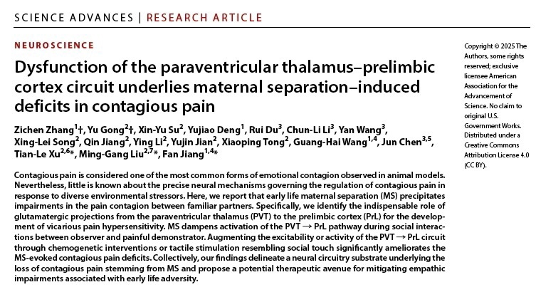 童年时期遭遇的逆境,如虐待、忽视或母婴分离,不仅会造成即时伤害,更会深远影响个体成年后的心理健康与社会功能。其中,共情能力的缺陷尤为显著,但其背后的大脑机制一直不甚明确。10月9日,国家儿童医学中心、上海交通大学医学院附属上海儿童医学中心发育行为儿科江帆教授、浙江省瓯江实验室刘明刚研究员与上海交通大学医学院徐天乐教授团队合作,在国际顶级期刊《科学·进展》上发表研究论文。该研究首次系统阐明,生命早期的母婴分离应激如何导致成年后对同伴疼痛“感同身受”的能力下降,其关键在于大脑中“丘脑室旁核-前边缘皮层”这一神经环路的功能失常。