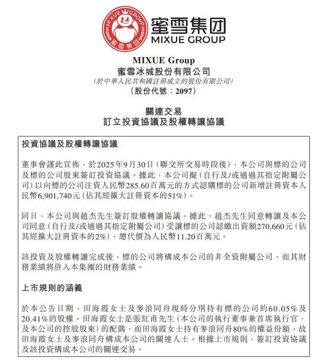 10月1日,蜜雪集团(HK.2097)于香港联交所发布公告,宣布以2.856亿元人民币增资福鹿家(郑州)企业管理有限公司,并以1120万元收购其2%股权,交易完成后合计持股53%。从持股比例看,股权转让完成后,蜜雪集团将成为福鹿家第一大股东。